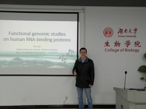 2020年12月29日上午10:30,湖北省“楚天学者”特聘教授、武汉大学医学研究院—肖锐教授,应邀来必赢做学术交流,并做了关于Functional Genomic Studies on Human RNA-Binding Proteins的精彩学术报告。该讲座在437bwin必赢国际官网U型楼B111举办,由437bwin必赢国际官网张定校教授主持。学院里众多老师和学生参加了该讲座。