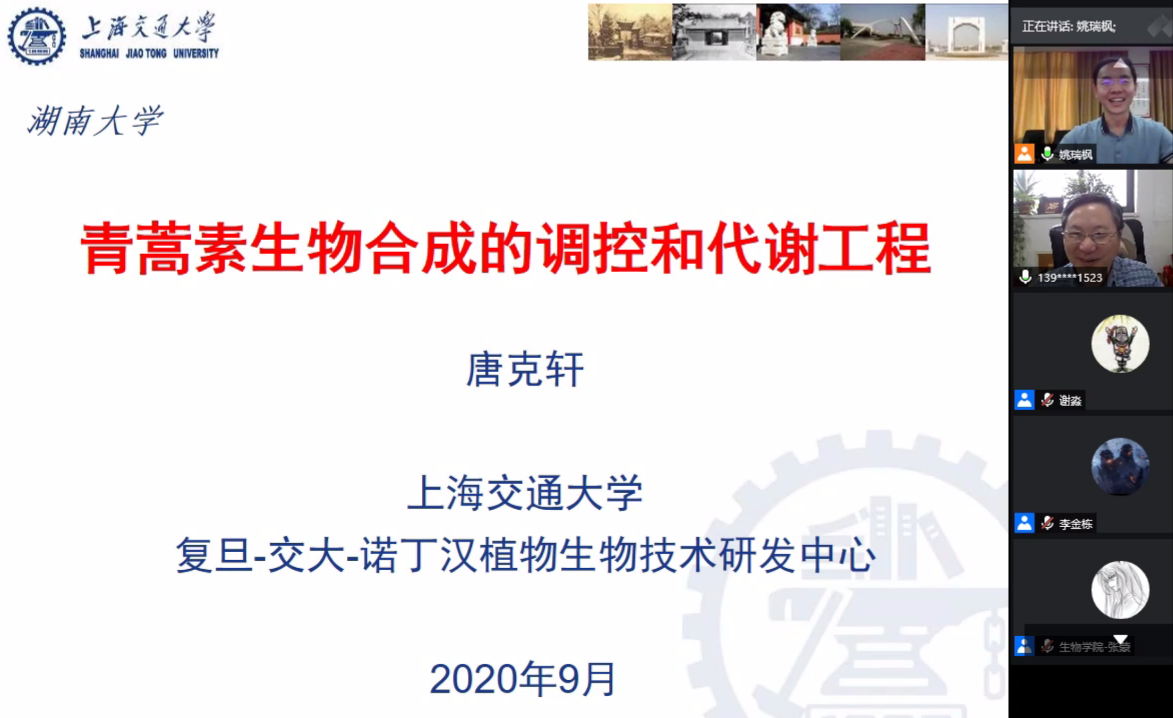 金秋九月,丹桂飘香。9月25日下午,上海交通大学特聘教授唐克轩老师应必赢437bwin必赢国际官网姚瑞枫教授邀请,在线作《青蒿素生物合成的的调控和代谢工程》的精彩报告,并与437bwin必赢国际官网师生进行了热烈的学术讨论与交流。本次报告由姚瑞枫教授主持,437bwin必赢国际官网相关老师及研究生近百人参加。