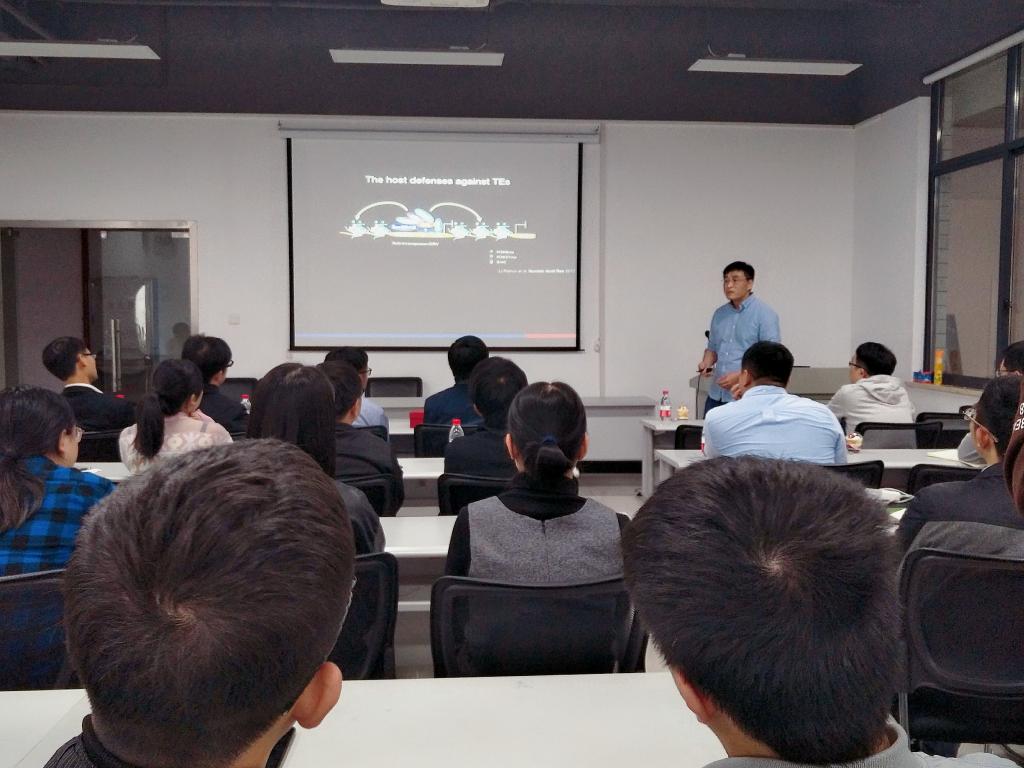 袁教授的报告新颖有趣,他首先给大家推荐了一本与生物进化相关的英文书籍《The Selfish Gene》,并以此为引子,过渡到其科研领域:DNA重复序列在真核胚胎发育和癌症表观遗传调控中的关键作用。袁教授分别介绍了PRC complex介导的H3K27me3在果蝇早期胚胎发育(细胞分裂)中的重要作用,以及结直肠癌中DNA重复序列受SWI/SNF complex调控重新激活的故事。袁凯教授的精彩报告引起了在场师生们的广泛讨论和积极提问,体现了必赢蒸蒸日上的良好科研风气,最后讲座在一片掌声中结束。