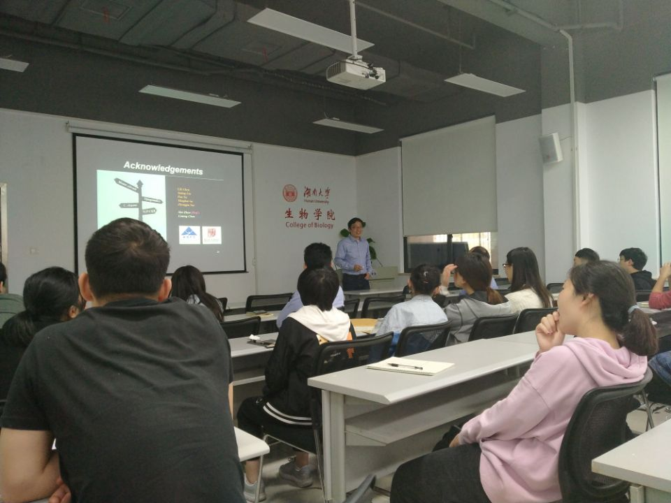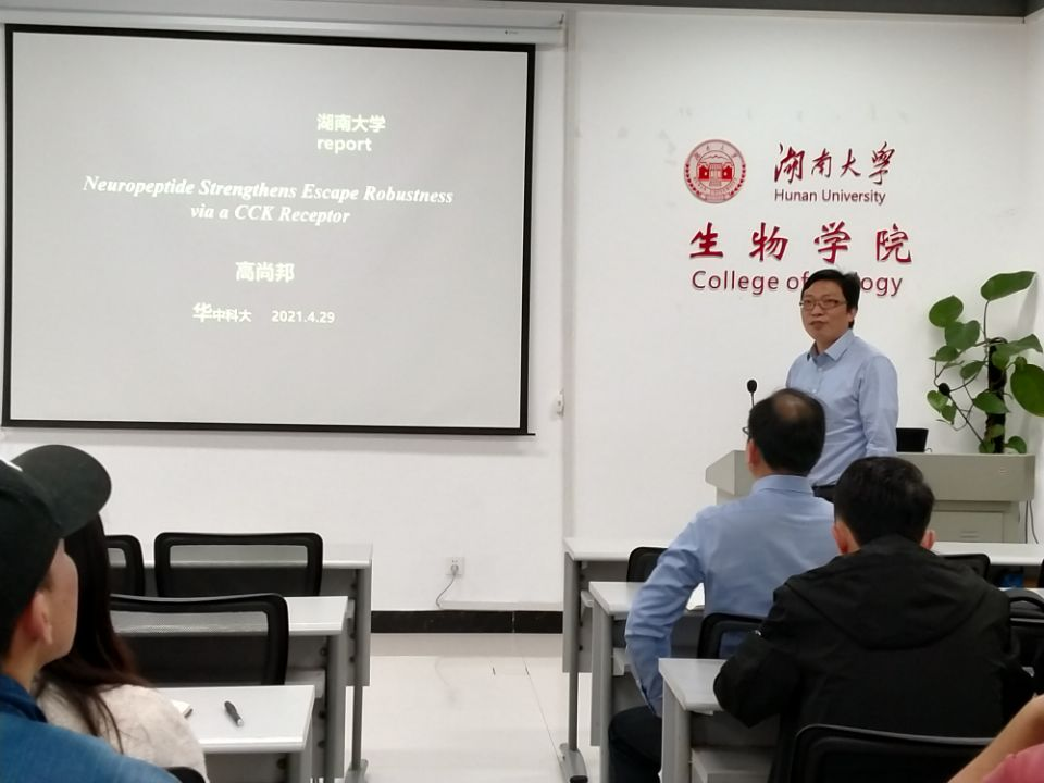 2021年4月29日下午15:00,华中科技大学生命科学与技术学院高尚邦教授应邀来必赢做学术交流,并做了题为Neuropeptide strengthens Escape Robustness via a CCK Receptor的讲座。该讲座在437bwin必赢国际官网U型楼B111举办,由437bwin必赢国际官网涂海军教授主持。学院里众多老师和学生参加了该讲座。