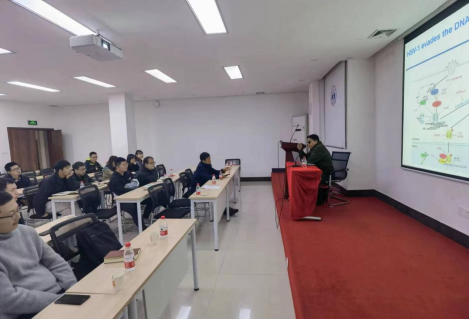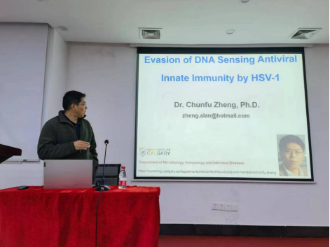 2023年4月24日下午,福建医科大学教授、加拿大University of Calgary兼职教授郑春福作为第140天马学术论坛主讲人应邀来必赢进行学术交流。郑教授为必赢师生介绍了其研究团队近些年在单纯疱疹病毒HSV-1如何进行免疫逃逸方面的研究工作,郑教授汇报的题目为“Evasion of DNA Sensing Antiviral Innate Immunity by HSV-1”。本次报告由邱烨副教授主持,437bwin必赢国际官网多位老师和学生参加,现场讨论激烈,学术氛围浓厚。