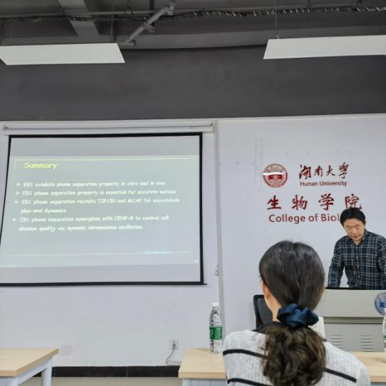 同时,姚老师提出了两个问题,一是着丝粒是怎么装配的,并且是由什么参与监管的,二是如何通过着丝粒可塑性地控制细胞质量。在他的研究中,他发现Apolo1可以引导细胞增殖同时还发现了一种马达蛋白CENP-E的新型抑制剂Syntelin。在研究中姚老师发现微管组装关键蛋白EB1的相分离在有丝分裂过程中对于着丝粒微管的附着是必不可少的。最后姚老师对其实验室的研究工作进行了总结。