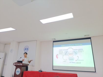 水稻是我国重要的粮食作物,水稻在生长发育过程中,会遭受不同病原菌的攻击,稻瘟病是水稻上一种毁灭性的植物病害。刘俊老师长期从事植物与病原菌互作的分子机制研究,在报告中,刘老师首先介绍了病原菌分泌的效应蛋白在植物免疫抑制、营养调控等过程中的分子功能,随后刘老师以乙烯和茉莉酸等植物激素为出发点,深入讲解了水稻在不同时期利用激素抵抗病害的分子基础,最后刘老师介绍了细胞损伤监视介导的水稻基础免疫。刘老师对水稻抗病机制的解析为水稻的抗病育种提供了新的理论基础。