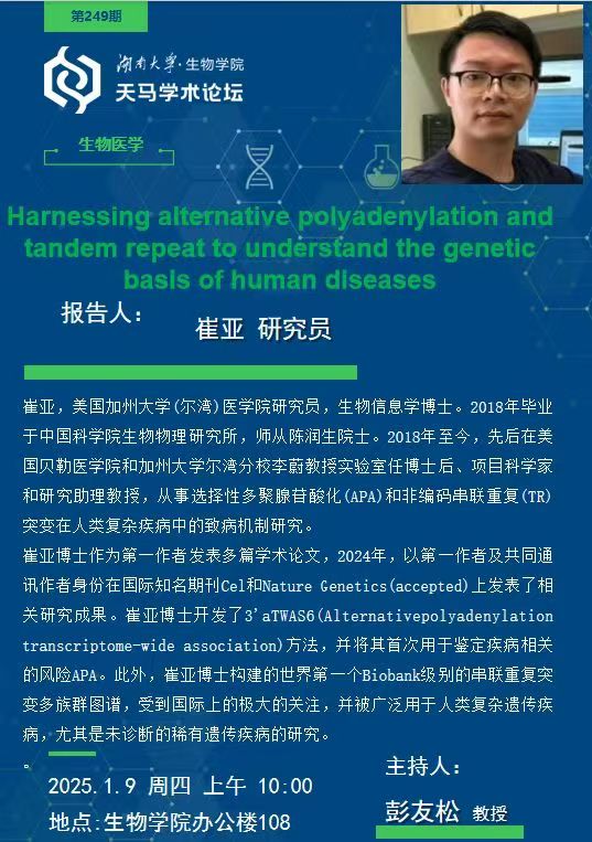 天马学术论坛 第249期 美国加州大学(尔湾)医学院 崔亚研究员