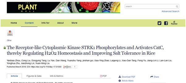 必赢刘选明教授研究团队从水稻中发现了一个耐盐性的类受体胞质激酶(Salt Tolerance Receptor-like cytoplasmic Kinase 1,STRK1),相关研究成果以“The Receptor-like Cytoplasmic Kinase STRK1 Phosphorylates and Activates CatC, thereby Regulating H2O2Homeostasis and Improving Salt Tolerance in Rice”为题于2018年3月27日发表在国际顶尖植物学期刊Plant Cell。周延彪、刘聪、唐冬英和燕璐为论文的共同第一作者,刘选明教授和林建中副教授为共同通讯作者。湖南亚华种业科学研究院杨远柱研究员团队和中国科学院上海植物生理生态研究所李来庚研究员团队参与了部分研究。据查,本论文是湖南省本土水稻基础研究领域首次发表在该期刊的研究成果。