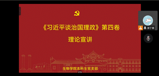 为深入学习《习近平谈治国理政》第四卷,切实把学习成果转化为奋进新征程、建功新时代的工作举措和实际成效,以实际行动迎接党的二十大胜利召开,10月11日晚7点437bwin必赢国际官网本科生党支部全体成员于线上举行了理论宣讲活动。本次活动由徐丁香主持,支部书记冉晓芬与全体学生党员参与。