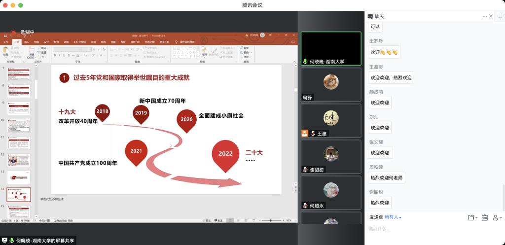 在会议的第二阶段,部分党员代表结合何老师分享内容以及自己的科研成果,畅谈了研究生在全面建设社会主义现代化国家新征程中的使命担当。谢甜甜同志表示:“作为研究生党员要把学习贯彻党的二十大精神作为第一堂党课,努力提高自己的政治素养和思想理论水平,在党赋予的光荣岗位上以‘学懂’、‘弄懂’、‘做实’的态度做出不平凡的新成绩。”卜会铜同志表示:“作为一名生物学博士,疫情当下进一步体现我们的价值,既是机遇也是挑战,要以实际行动践行党的二十大精神,在第二个百年奋斗目标的新征程上展现青春动能。” 刘匀毅同志就“加强基础研究”发表了自己的见解,“作为新时代的接班人,需要肩负起历史使命,抱有远大理想、努力提高自身素养、调整心态、摆好位置、树立终身学习的观念,奋力谱写全面建设社会主义现代化国家的崭新篇章。”刘翠翠、张运生、简珂等同志一一发言,从不同角度对如何落实二十大精神在自己的科研工作中发表了见解。大家的分享充分展现了当代湖大人的责任与担当,在全支部树立了模范就在身边的意识观念,向优秀学习,向先进看齐,进一步促进了党建特色与学术科研优势的深度融合。