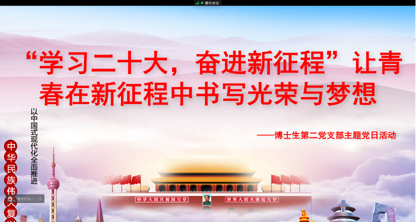为学习宣传贯彻党的二十大精神,团结引领研究生党员把思想和行动统一到党的二十大精神上来,落实到具体工作中去,2022年11月15日,437bwin必赢国际官网博士生第二党支部特别邀请学院党委委员,副院长,何晓晓教授组织开展“学习二十大,奋进新征程”让青春在新征程中书写光荣与梦想主题党日活动,帮助大家将学习贯彻党的二十大精神文件要求自觉转变为思想指引,畅谈研究生在全面建设社会主义现代化国家新征程中的使命担当。博士生第二党支部全体党员、发展对象以及入党积极分子参会,党支部书记王建主持会议。