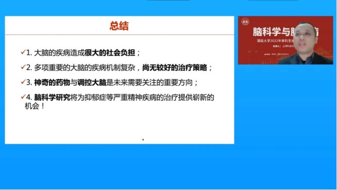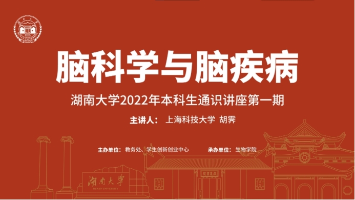 4月1日,为了丰富必赢学子在疫情防控特护期的学习内容,学校启动了本科生线上通识讲座,邀请校内外顶尖学者、知名教授及行业专家,聚焦前沿科技和人文历史,围绕重大科研成果、重要学术成就、突出创新创业事迹等,将为本科生开设线上系列高水平通识讲座。此次活动以“脑科学与脑疾病”为主题,由教务(学生创新创业中心)主办,437bwin必赢国际官网承办,437bwin必赢国际官网副院长涂海军教授主持,上海科技大学研究员、博士研究生导师胡霁教授进行演讲。