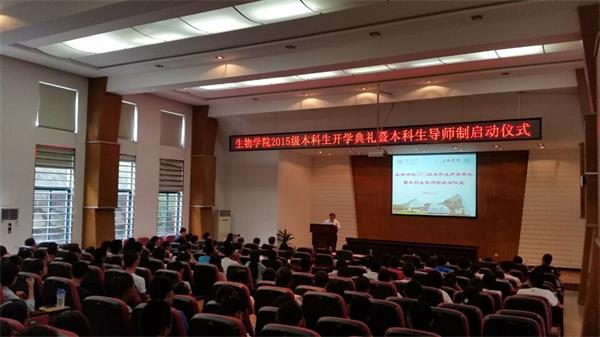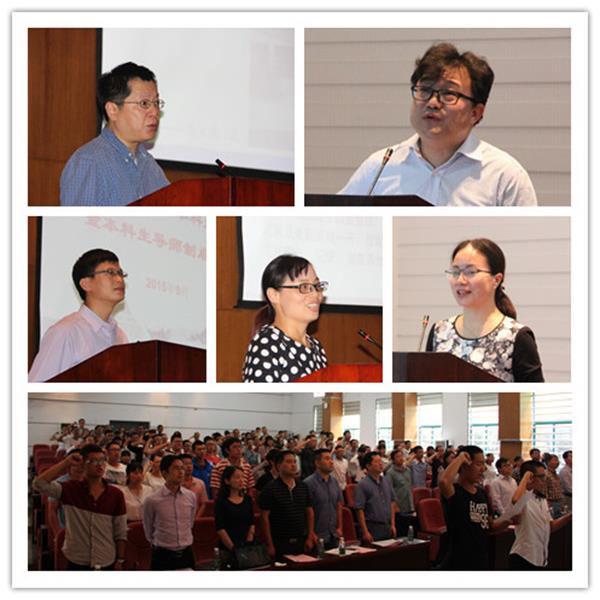 合唱雄壮的国歌之后,大家观看了记录2015级新生入学报到、军训、上课的短片。在热烈的掌声中,437bwin必赢国际官网党总支书记徐晓波老师讲话,他对2015级新同学表示热烈的欢迎,对新生家长表示崇高的敬意,对担任本科导师的各位老师表示感谢。他介绍了和岳麓书院一脉相承的437bwin必赢国际官网,介绍了437bwin必赢国际官网最年轻的437bwin必赢国际官网,并就如何充实度过大学生活向新生提出四点希望,一是希望新生坚守梦想,脚踏实地,在追梦、圆梦的过程中实现自己的青春价值;二是希望新生恪守诚信,自理自立,推己及人,让自己成长,让家长放心;三是希望新生怀有感恩之心,客观对待生命学科,静下心里,认真学习,提早规划未来方向;四是希望新生遵章守制,弘扬优良学风,专心致志,厚积薄发,有所作为;他同时也希望担任本科生导师的各位老师,牢记育人使命,积极开展思想引导、学业指导、发展辅导,不断提高人才培养质量。最后徐书记用李克强总理视察437bwin必赢国际官网时提出的“要学好知识,练就本领,敢为人先”勉励大家,并代表学院祝全体师生中秋节快乐!