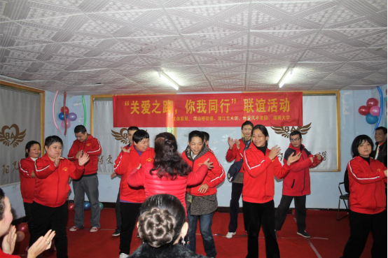 雨后的低温降低不了志愿者的热情,在来到目的地之后,作为主持人的陈祺仪同学马上开始调动房间的气氛,志愿者们也十分积极地与这群特殊“小朋友”展开了互动。先是由湘江艺术团一位老师带领“小朋友们”表演的《歌唱小儿放牛郎》。他们通过歌唱向志愿者们展示了其率真、感性的一面,而在歌曲结束时,他们还自发地大声说出“谢谢老师”这四个字,来感谢一直参与志愿活动并坚持教他们歌唱与舞蹈的老师,真情实感地流露不免让志愿者为之感动。
