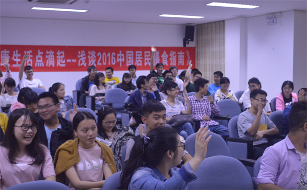 曾敏婕老师首先向同学们生动有趣地介绍了2016年新改版的中国营养膳食指南——膳食宝塔,其中包括大家每天需要摄入的水、谷薯类、蔬菜水果、肉、大豆及奶制品、油盐等,并与现场的同学们进行了有奖竞猜,现场氛围轻松活跃。曾老师还幽默地用“四条腿的不如两条腿的,两条腿的不如没有腿的”做比喻,来说明我们应该吃什么才最有营养。随后曾护士长向同学们讲了两个由于宵夜而引发的“惨案”——一位同学由于吃夜宵导致急性肠胃炎,而另一位在吃口味虾时,不慎用钳子卡住了喉咙。她在此特别强调了吃宵夜的危害并表示宵夜会给肠胃带来极大的负担,希望大家能够爱护自己的身体并对宵夜说不。紧接着曾老师又向同学们介绍了湖南的美食及其特点——辣、油、咸,并告诫大家平时的日常饮食应该少油、少盐,要健康地食在湖南。最后曾老师以健康文化节的活动口号“健康中国,营养先行”结束了本次讲座。