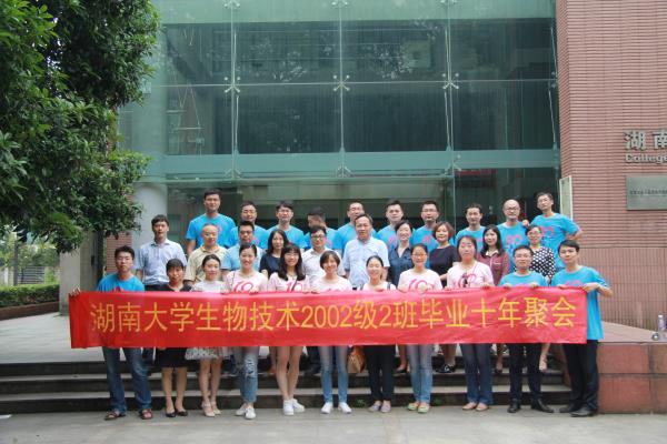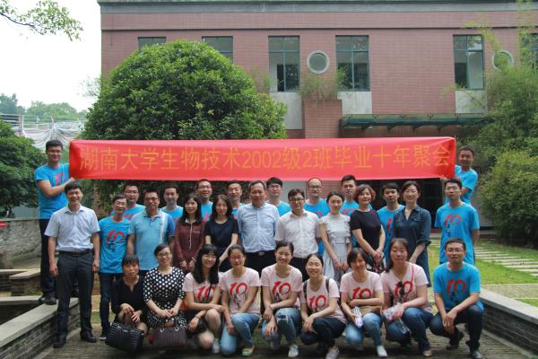 2016年5月14日,二十余名437bwin必赢国际官网生物技术专业首届(2002级)毕业生回到母校,组织毕业十周年聚会。此次聚会中校友们安排了非常丰富的活动,包括游览岳麓书院、重温校园,参观437bwin必赢国际官网院楼和实验平台,为学院捐赠一颗丹桂、与老师共植绿树,邀请学院领导和老师们一起座谈,追忆往昔,进行亲切的交流,并同时参加了由生物院学生会主办的健康文化节。时光流转,而生物院情谊仍不减。