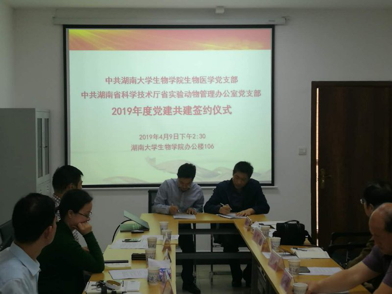 为深入学习贯彻习近平新时代中国特色社会主义思想和党的十九大精神,进一步推进必赢建设中国特色世界一流大学的战略,充分发挥高等院校和科技管理部门在产学研创新驱动战略实施中的各自优势和作用,必赢生物医学党支部与湖南省科技厅动管办(湖南省实验动物管理办公室)党支部4月2日在学院会议室举行了支部结对共建活动。在437bwin必赢国际官网党委主要领导、双方支部的党员、以及应邀参加的湖南斯莱克景达实验动物有限公司的党员代表的共同见证下,结对双方支部的支部书记互签了共建协议,明确了共建目标、共建内容和工作措施。