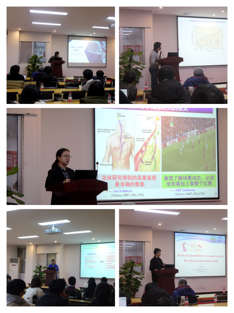 参与本次学术年会报告环节的12老师、4位研究生围绕核酸适配体与肿瘤活体荧光分子成像、肿瘤与非编码RNA、类受体激酶调控水稻耐盐性的分子机制、MicroRNA在柯萨奇病毒感染及病毒性心肌炎中的作用、木质素的生物利用等主题内容,进行了生动详实的报告展示。交流互动环节师生发言踊跃,会场气氛热烈。