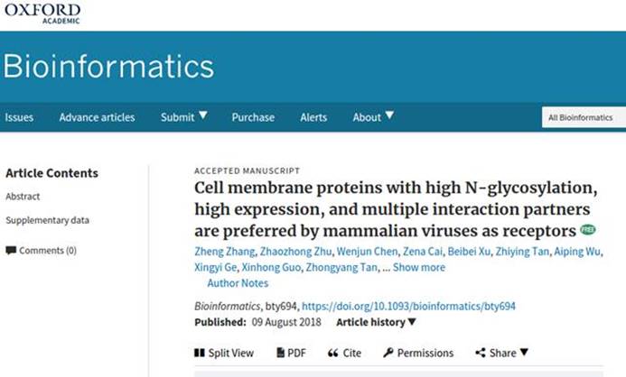 病毒受体对于病毒进入宿主细胞非常关键,很大程度上决定了病毒的组织与宿主特异性。目前病毒受体的确定主要采用实验方法,不仅费时费力,而且非常困难。科学家估计地球上可能感染人的病毒有几十万种,但迄今为止只有100多种病毒的受体得到了确定。如何更有效地确定病毒的受体是病毒学研究中的重要挑战。随着大数据时代的到来,生物信息学在生物医学研究中发挥着越来越重要的作用。2018年8月9日来自437bwin必赢国际官网生物信息学与病原学研究团队在国际生物信息学专业权威期刊《Bioinformatics》发表题为Membrane proteins with high N-glycosylation, high expression, and multiple interaction partners were preferred by mammalian viruses as receptors的文章。