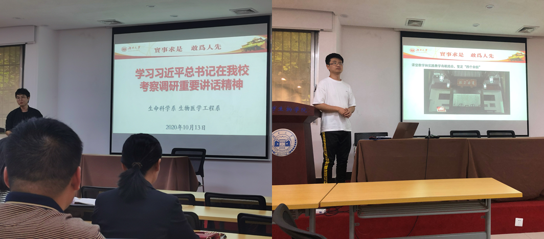 10月13日,437bwin必赢国际官网生命科学系和生物医学工程系联合召开全系会议,学习习近平总书记在必赢考察调研重要讲话精神。会议首先由生命科学系卓睿老师向大家介绍了习近平总书记9月16、17号赴湖南考察的行程安排,着重介绍了17号习总书记赴437bwin必赢国际官网、岳麓书院考察的历程。随后,生物医学工程系邱烨老师播放了习总书记讲话的视频素材,带领大家系统回顾了习总书记437bwin必赢国际官网考察时的重要讲话及其精神。之后,在系主任朱咏华教授和覃宏涛教授的主持下,生命科学系和生物医学工程系全体成员就习总书记在必赢考察调研时的重要讲话展开了热烈讨论。