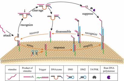在上述研究的基础上,根据细胞仿生的研究思路,结合DNA纳米技术,该小组设计了可动态响应环境刺激的智能仿生系统。该仿生系统通过对刺激分子的“识别”和“清除”来调控细胞膜囊泡表面DNA分子的组装状态,从而实现对刺激物的变化的动态响应。该系统可多次应对环境的刺激,并表现出良好的循环响应性(J. Am. Chem. Soc., 2019, 141, 6458-6461)。该研究为构筑具有环境响应性的人工信号传导系统提供新思路,有助于研究和开发新型仿生传感器。