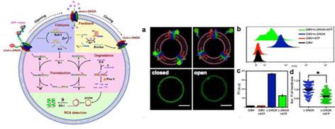最近,该小组进一步采用DNA纳米技术构筑功能模块,利用DNA分子间的动态链置换反应构筑基于DNA分子组成的“信息处理器”来调节囊泡内部组分对外界环境的响应。通过使用核酸适体作为组成信号系统的激活单元,DNA熵驱动的链置换反应作为信号传递与驱动单元,同时设计串联的信号反馈单元,建立一种在囊泡内部对外界特定分子刺激产生响应的人工信号网络系统,实现细胞膜囊泡对外界环境刺激的智能调节和反馈(Nature Commun., 2020, 11, 978)。这种基于DNA分子的人工信号网络系统充分展示了细胞膜囊泡巨大的构造潜力,为模拟细胞与环境之间的物质交换与信息传递提供了研究平台,丰富了新型智能仿生系统的设计思路和方法。