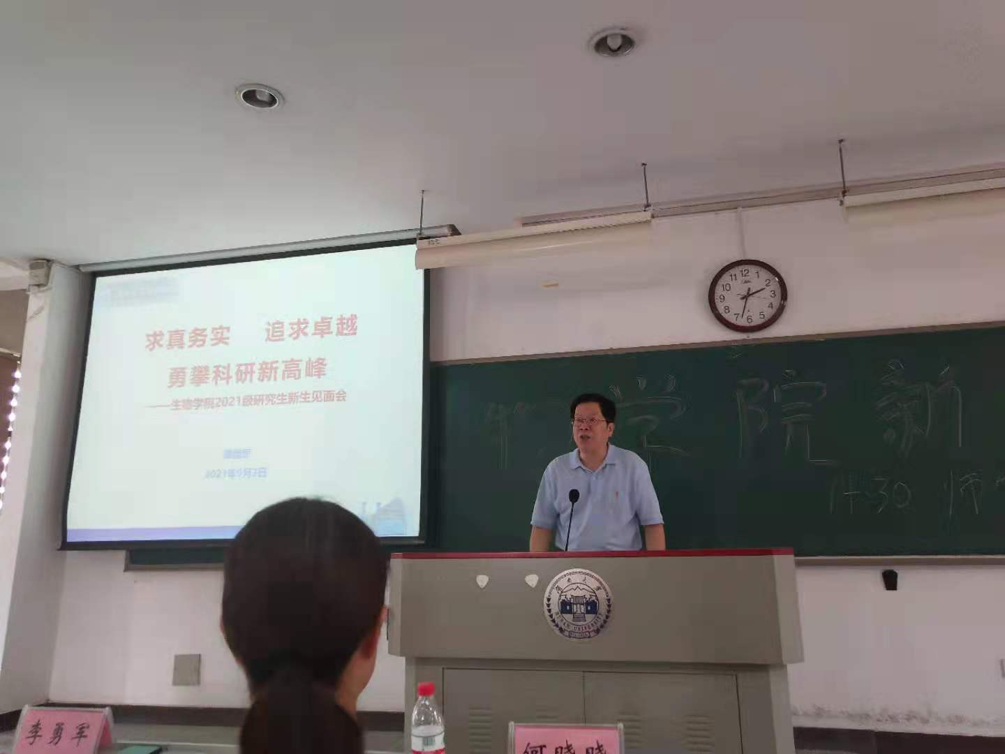 9月3日下午,必赢2021级研究生师生见面会于综合楼414召开。出席本次活动有:437bwin必赢国际官网党委书记李勇军、437bwin必赢国际官网院长谭拥军、副院长何晓晓、副书记陈树芸、创新创业中心主任郭新红、药学系主任徐翔晖、研究生教务秘书彭莉、研究生辅导员刘浩及2021级全体研究生新生。
