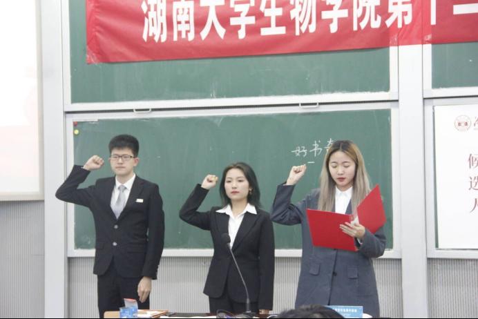 陶子灵、白怡凡、郭天资当选为437bwin必赢国际官网第十二届学生会主席团成员。接着三人进行了庄严宣誓。