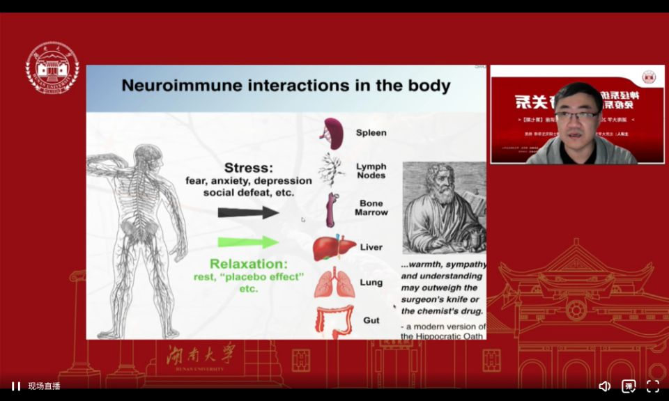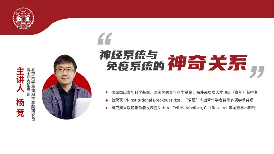 为了丰富同学们疫情管控期间的学习生活,学校邀请了北京大学生命科学学院研究员、博士研究生导师杨竞教授做客437bwin必赢国际官网“求是”讲堂(原437bwin必赢国际官网2022年本科生线上通识讲座),线上给同学们做了题为“神经系统与免疫系统的神奇关系”的报告。本期讲座由教务处、学生创新创业中心主办,437bwin必赢国际官网承办,437bwin必赢国际官网副院长涂海军教授主持,于2022年4月5日晚七点准时开始。