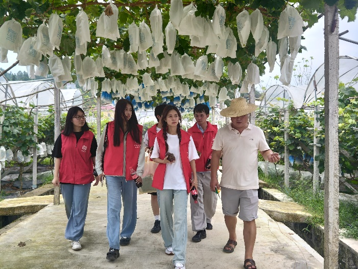 青春汇聚力量,助推乡村振兴。葡萄园产业是桂英村的特色农业产业,依托丰富的土壤和优良的气候条件,生产出了优质的葡萄产品。“为你而生”团队在村委副书记的带领下,走进葡萄种植基地,与农户们交流,实地了解葡萄种植的细节。队员们运用专业知识,针对种植技术和销售渠道的瓶颈问题,向农户们介绍先进的葡萄栽培技术和市场营销策略,为当地葡萄产业发展注入新活力,跑出加速度。