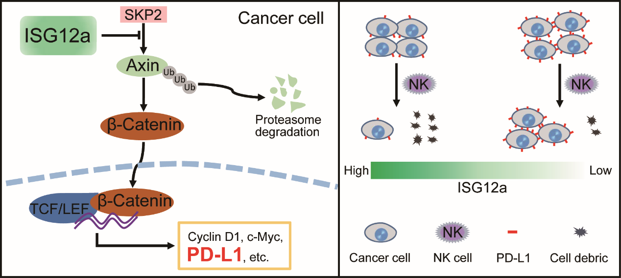在 SCI 一区知名免疫学期刊 Cellular & Molecular Immunology 最新online的网站上刊发了437bwin必赢国际官网、医学病毒学湖南省重点实验室、化学生物传感与计量学国家重点实验室朱海珍教授课题组联合湖南省肿瘤医院、吉林大学第一医院、中南大学公共卫生学院、中科院上海生物化学与细胞生物学研究所多中心合作发表的题为 “The innate immune effector ISG12a promotes cancer immunity by suppressing the canonical Wnt/β-catenin signaling pathway” 的研究性论文 [1],该论文的第一作者为437bwin必赢国际官网博士研究生邓日林,通讯作者为朱海珍教授。该研究以先天免疫效应分子 ISG12a 为核心,重点阐述了其在肿瘤细胞中通过维持经典 Wnt/β-catenin 信号通路中的降解复合物支架蛋白 Axin 的稳定,促进肿瘤细胞免疫检查点 PD-L1 的新发转录因子 β-catenin 的泛素化降解,抑制经典 Wnt/β-catenin 信号通路,并进一步阻断 PD-1/PD-L1 信号轴,进而促进 NK 细胞介导抗肿瘤免疫的重要机理。通过染色质免疫共沉淀、双荧光素酶报告基因和流式细胞术等实验方法,发现并证明了 β-catenin 是 PD-L1 的转录因子,揭示了经典癌症信号通路 Wnt/β-catenin 负调控肿瘤免疫的新机制。ISG12a 通过促进 β-catenin 的降解,实现其对 PD-L1 基因的转录抑制,最终下调了肿瘤细胞表面 PD-L1 的蛋白水平,发挥促进肿瘤免疫功能。此外,该研究还发现了 ISG12a 在肿瘤细胞增殖、迁移、转移和癌细胞干性以及EMT转化中的重要作用,将其命名为一种新的抑癌基因,揭示了其与肿瘤的临床预后和恶性转化之间的重要联系。