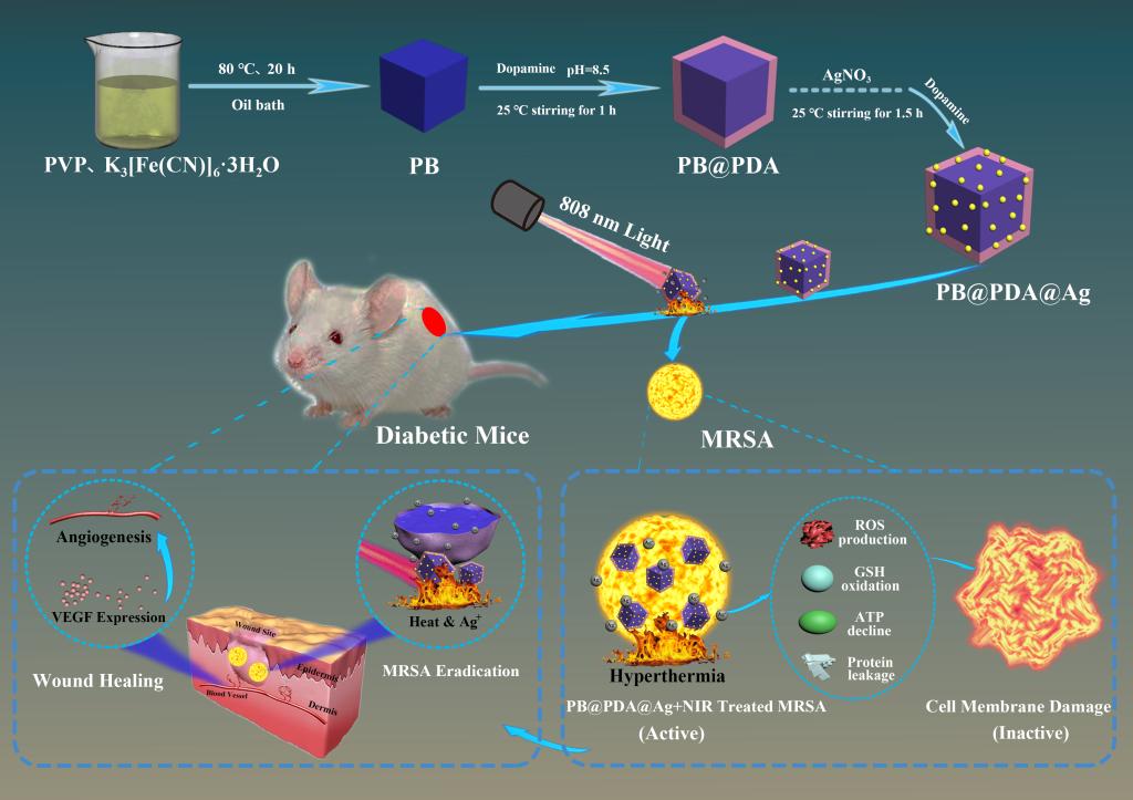437bwin必赢国际官网刘斌副教授课题组针对纳米银材料的团聚和抗菌效能问题,创造性的将银纳米粒子镶嵌在具有良好光热性能的普鲁士蓝纳米复合物表面,构建了一种双模式纳米抗菌复合物,结合近红外光激光照射技术,有效地促进了糖尿病小鼠多药耐药菌感染伤口的快速愈合。体外研究显示:这种联合抗菌策略通过破坏细胞完整性、产生ROS、降低ATP、氧化GSH等途径发挥抗多药耐药菌MRSA作用;体内实验表明:该策略通过减轻局部炎症反应和诱导创面血管内皮生长因子表达来促进MRSA感染的糖尿病创面愈合。研究结果以论文形式发表在生物材料Top期刊Biomaterials(10.1016/j.biomaterials.2020.119936),并已同步申请专利(CN201911347212.6),为后续产品研发奠定了坚实的基础。论文第一单位为437bwin必赢国际官网,第一作者为437bwin必赢国际官网童春义副教授、湖南师范大学钟祥华硕士生和杨粤军教授,437bwin必赢国际官网刘斌副教授和湖南中医药大学王炜教授为并列通讯作者。