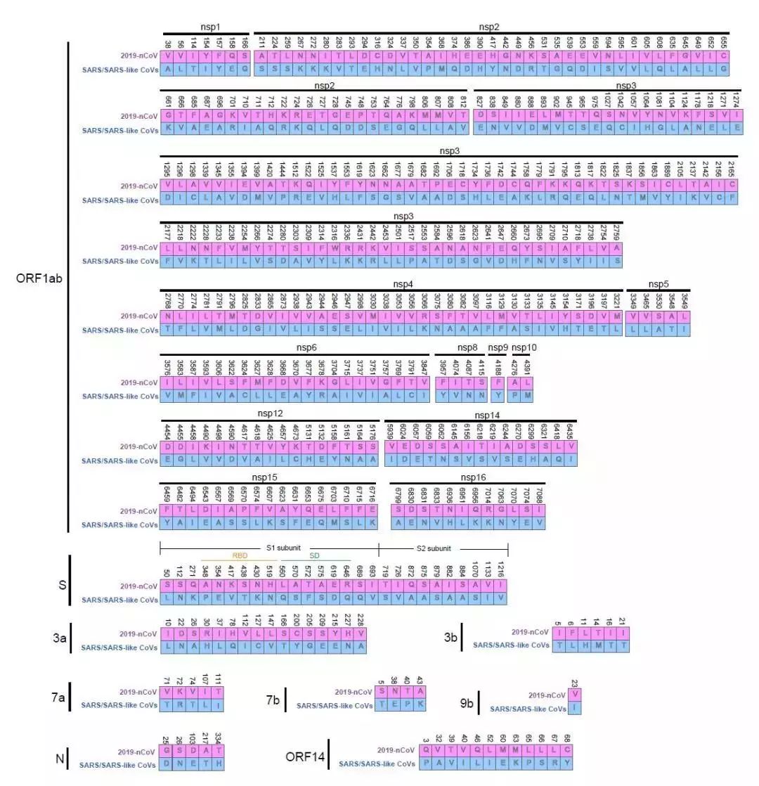 研究者进一步分析发现在2019-nCoV与SARS和SARS样病毒的氨基酸序列之间存在380个氨基酸的差异,比如在S蛋白上,2019-nCoV相对于SARS-CoV在直接与人类受体ACE2蛋白相互作用的受体结合基序中不存在氨基酸替换,但是RBD(受体结合区)的其他区域发生了6个氨基酸替换。这些氨基酸水平差异可能有助于揭示2019-nCoV与SARS病毒在传染性和致病力上的潜在差异。