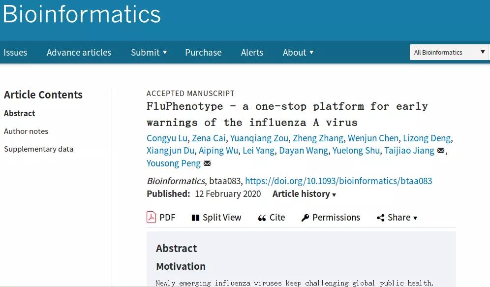 2月12日,437bwin必赢国际官网联合苏州系统医学研究所、中国国家流感中心和中山大学等单位,成功开发基于分子标记物的流感病毒表型预测平台FluPhenotype,并在国际生物信息学专业权威期刊《Bioinformatics》发表题为“FluPhenotype-a one-stop platform for early warnings of the influenza A virus"的文章进行相关介绍。该文章的第一作者为437bwin必赢国际官网硕士研究生卢聪毓和博士研究生蔡泽娜,通讯作者为437bwin必赢国际官网副教授彭友松与苏州系统医学研究所蒋太交教授。
