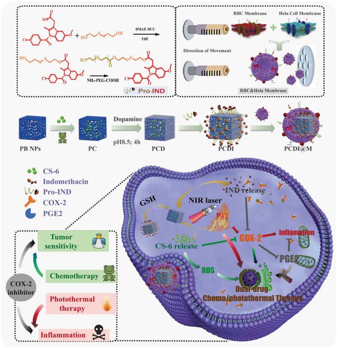 基于课题组前期对光热疗法、蟾蜍来源天然化合物日蟾毒他灵(CS-6)的研究基础上(Biomaterials, 2020, 243:119936; Biomaterials, 2019, 217: 119301; Acta Biomaterialia, 2020, 113: 554-569等),我们提出利用吲哚美辛抑制维持肿瘤炎症微环境的关键酶蛋白COX-2的表达水平,进一步提高日蟾毒他灵(CS-6)与光热疗法联合抗肿瘤疗效的设想,构建了一种基于普鲁士蓝纳米颗粒的抗宫颈癌的前药体系,在荷瘤小鼠模型上取得显著疗效,为发展可用于宫颈癌多模式治疗技术奠定了良好的研究基础。近日,该研究工作在线发表在生物医药领域顶级期刊Journal of Controlled Release(10.1016/j.jconrel.2021.09.034),并已同步申请专利。论文第一作者为必赢硕士生肖畅和副教授童春义博士,刘斌教授为第一通讯作者。