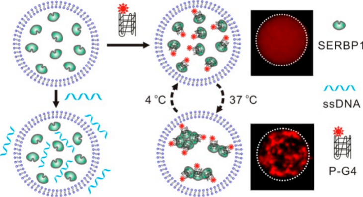 此外,利用源于细胞的细胞膜囊泡作为简化的细胞模型,该课题组研究了不同序列的单链DNA分子诱导蛋白相分离的行为。众所周知,蛋白等生物大分子相分离在调控基因表达、信号转导等生物学过程中发挥重要作用。作为一种重要的生物分子-核酸不仅参与蛋白相分离形成凝聚体的过程,还可以调控凝聚体的性质和功能。然而,核酸分子的二级结构和序列对其诱导蛋白相分离的影响仍不清楚,亟须开发具有类似细胞的简化细胞模型来研究核酸诱导蛋白相分离的行为。该工作中研究人员将细胞膜囊泡作为简化的细胞模型,研究了细胞膜囊泡对特定结构的核酸分子的富集行为并鉴定了可特异结合平行G-四链体结构的新型相分离蛋白SERBP1。进一步研究结果显示,囊泡内部的SERBP1蛋白特异性地与核酸分子结合并产生蛋白-核酸凝聚体,而且这种蛋白-核酸凝聚体具有温度依赖和可逆的相分离特性(J. Am. Chem. Soc. 2021, 143, 11036-11043)。该课题组开发的基于细胞膜囊泡的人工细胞模型为核酸诱导蛋白相分离研究提供一种全新的研究体系,有助于深入了解核酸诱导蛋白相分离相关的作用机制。