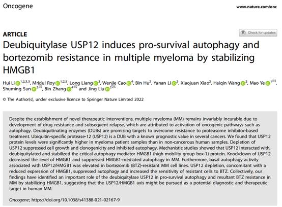 2022年1月7日,437bwin必赢国际官网叶茂教授团队在国际肿瘤学知名期刊Oncogene(IF=9.867)在线发表题为“Deubiquitylase USP12 induces pro-survival autophagy and bortezomib resistance of multiple myeloma by stabilizing HMGB1”的原创性论著。该研究首次阐明USP12在MM细胞中与HMGB1(high mobility group box-1)相互作用,通过去泛素化并稳定HMGB1诱导MM细胞发生自噬,促进MM细胞增殖与耐药的功能与分子机制。该论文由437bwin必赢国际官网叶茂教授团队与中南大学刘静教授团队合作完成,437bwin必赢国际官网为第一通讯单位,叶茂教授为第一通讯作者,437bwin必赢国际官网博士后荔辉与Mridul Roy为该论文共同第一作者。该研究受到科技部国家重点研发计划、国家自然科学基金、湖南省自然科学基金等项目的资助。