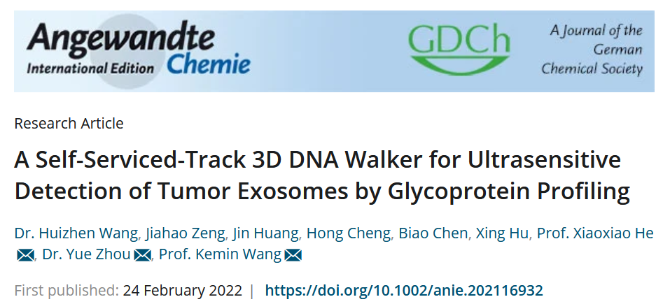 王柯敏/何晓晓团队和湖南省肿瘤医院等单位合作,报道了一种基于轨道自助型三维DNA步行器的肿瘤外泌体糖蛋白分析与超灵敏检测方法,相关研究成果以“A Self-Serviced-Track 3D DNA Walker for Ultrasensitive Detection of Tumor Exosomes by Glycoprotein Profiling”为题发表在国际化学领域权威期刊《德国应用化学》(Angewandte Chemie International Edition)上。437bwin必赢国际官网博士研究生王绘珍是论文的第一作者。