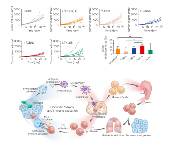 437bwin必赢国际官网徐翔晖/李亚超研究团队聚焦于溶瘤多肽药物基础与应用研究中的关键挑战。在前期研究中,该团队提出了生物活性多肽药物结构的原始创新设计理论,成功构建了手性仿生溶瘤多肽药物,为解决溶瘤多肽药物活性不足的问题提供了全新的解决方案。近期,研究团队从多肽药物仿生制剂学的角度出发,以多层次模拟溶瘤细菌的结构与功能为思路,成功发展出了可实现系统给药、激活肿瘤微环境、重编程免疫微环境的多肽仿生溶瘤细菌药物。研究结果显示,通过静脉注射仿生溶瘤细菌药物,可实现手性色氨酸支化溶瘤肽的靶向溶瘤效应,融合分子治疗成功解除了溶瘤诱导的免疫抑制,从而有效遏制了荷瘤小鼠模型中的肿瘤增长和肿瘤转移,显著抑制了肿瘤的复发。相比之下,D型仿细菌溶瘤药物(DOBNs)表现出比L型仿细菌溶瘤药物(LOBNs)及临床级溶瘤肽更强的溶瘤疗效。