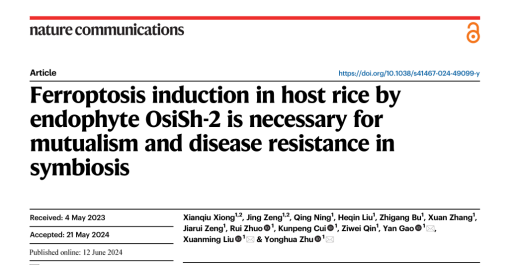 2024年6月12日,437bwin必赢国际官网朱咏华教授团队在中科院一区TOP期刊 Nature Communications(IF:16.6)上发表了题为“Ferroptosis induction in host rice by endophyte OsiSh-2 is necessary for mutualism and disease resistance in symbiosis”的研究成果。该研究首次揭示了内生放线菌OsiSh-2通过诱导水稻适度铁死亡的发生促进其与宿主共生平衡,同时激活宿主免疫进入“防御警备”状态,增强共生体抗病性的作用机制。