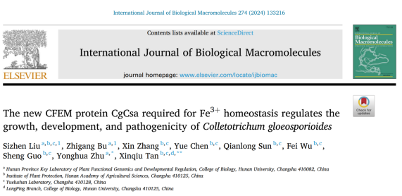 2024年6月18日,437bwin必赢国际官网朱咏华教授团队与湖南省植物保护研究所谭新球研究员团队合作在中科院一区TOP期刊International Journal of Biological Macromolecules (IF: 8.2)发表题为“The new CFEM protein CgCsa required for Fe3+ homeostasis regulates the growth, development, and pathogenicity of Colletotrichum gloeosporioides”的研究论文。该研究首次揭示CFEM效应蛋白CgCsa在C. gloeosporioides的致病性、细胞壁和细胞膜的完整性以及生长发育中起着关键作用,并且CFEM效应蛋白能够结合铁,维持C. gloeosporioides的铁稳态,动态调控病原菌生长和致病过程。