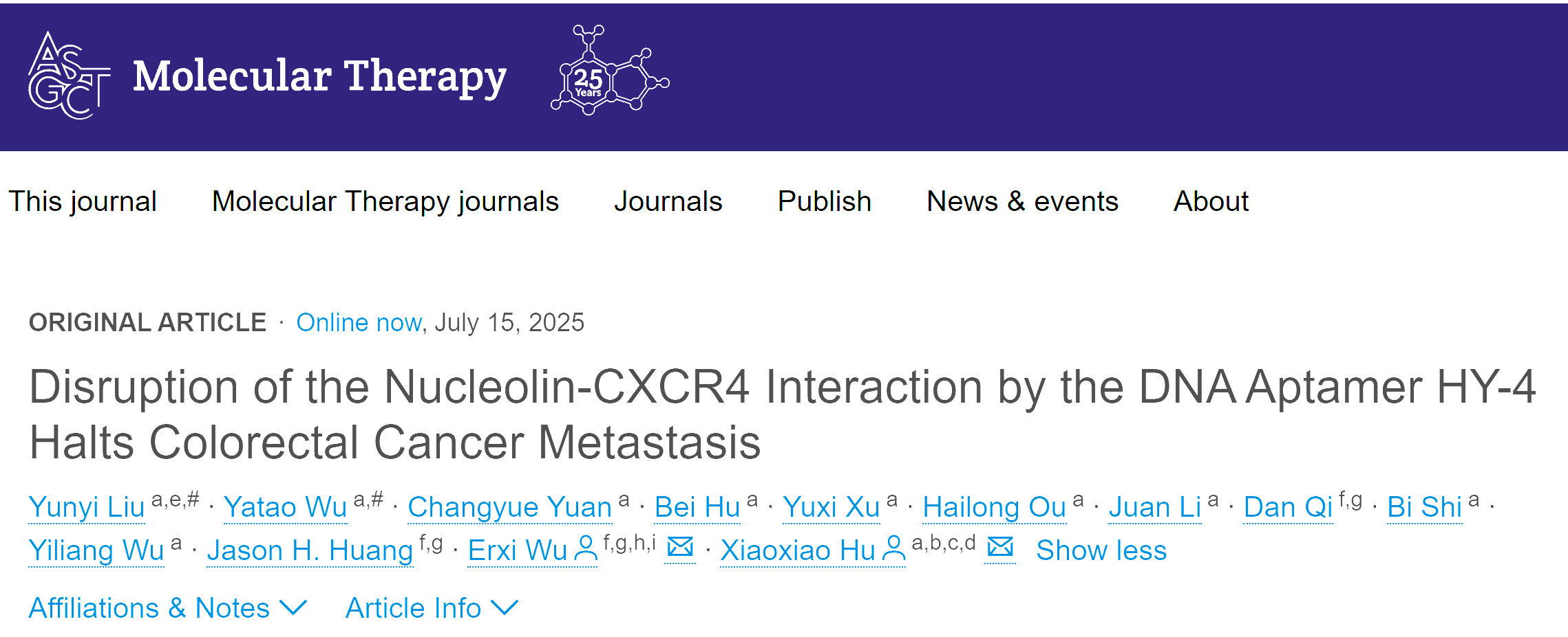 2025年7月16日,437bwin必赢国际官网胡小晓课题组在CellPress出版的医学领域权威期刊Molecular Therapy上在线发表了题为“Disruption of Nucleolin-CXCR4 Interaction by DNA Aptamer HY-4 Halts Colorectal Cancer Metastasis”的研究论文。在该研究中,研究者通过X-aptamer技术增强和扩展了SWAN文库,并鉴定了一种特异性靶向结直肠癌的新核酸适体HY-4。通过人结肠直肠癌异种移植裸鼠模型靶向实验证明了HY-4能在活体水平特异性靶向结直肠癌细胞。进一步通过拉下实验和MS/LC蛋白质组学质谱测序分析确定其分子靶标为核仁素蛋白(Nucleolin、NCL),并在Tranwell迁移和侵袭实验验证了HY-4对结直肠癌细胞转移的抑制效果。
